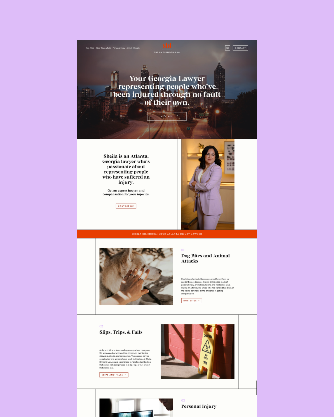 Sheila Bilimoria Law: a unique, bold personal injury lawyer website design in Squarespace